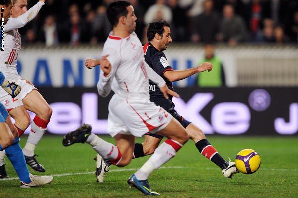 - Sur un long dégagement de Landreau, Hoarau posté à trente mètres des cages adverses, dévie de la tête en profondeur. A la lutte avec Rami, Giuly contre la tentative de dégagement du Lillois et profite de la sortie de Malicki loin de son but pour pousser le ballon au fond des filets (40', 1-0).