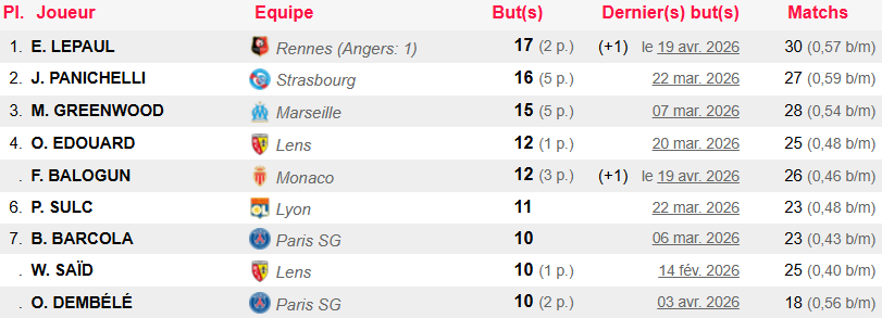 Le classement des buteurs en Ligue 1 (au 20.04.2026)
