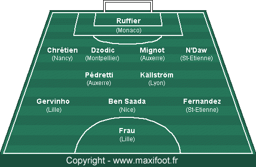 73. Armand, Giuly (Paris SG), Blondel, Pelé (Toulouse), Bonnart, Morientes, Mandanda (Marseille), Bangoura (Rennes), Diarra (Lorient), Coutadeur (Le Mans puis Monaco), Yahia (Lens), Thil, Cuvillier (Boulogne), Pitau (Montpellier), Ilan, Matuidi, Janot (Saint-Etienne), Tiéné, Pujol (Valenciennes) – 1 point